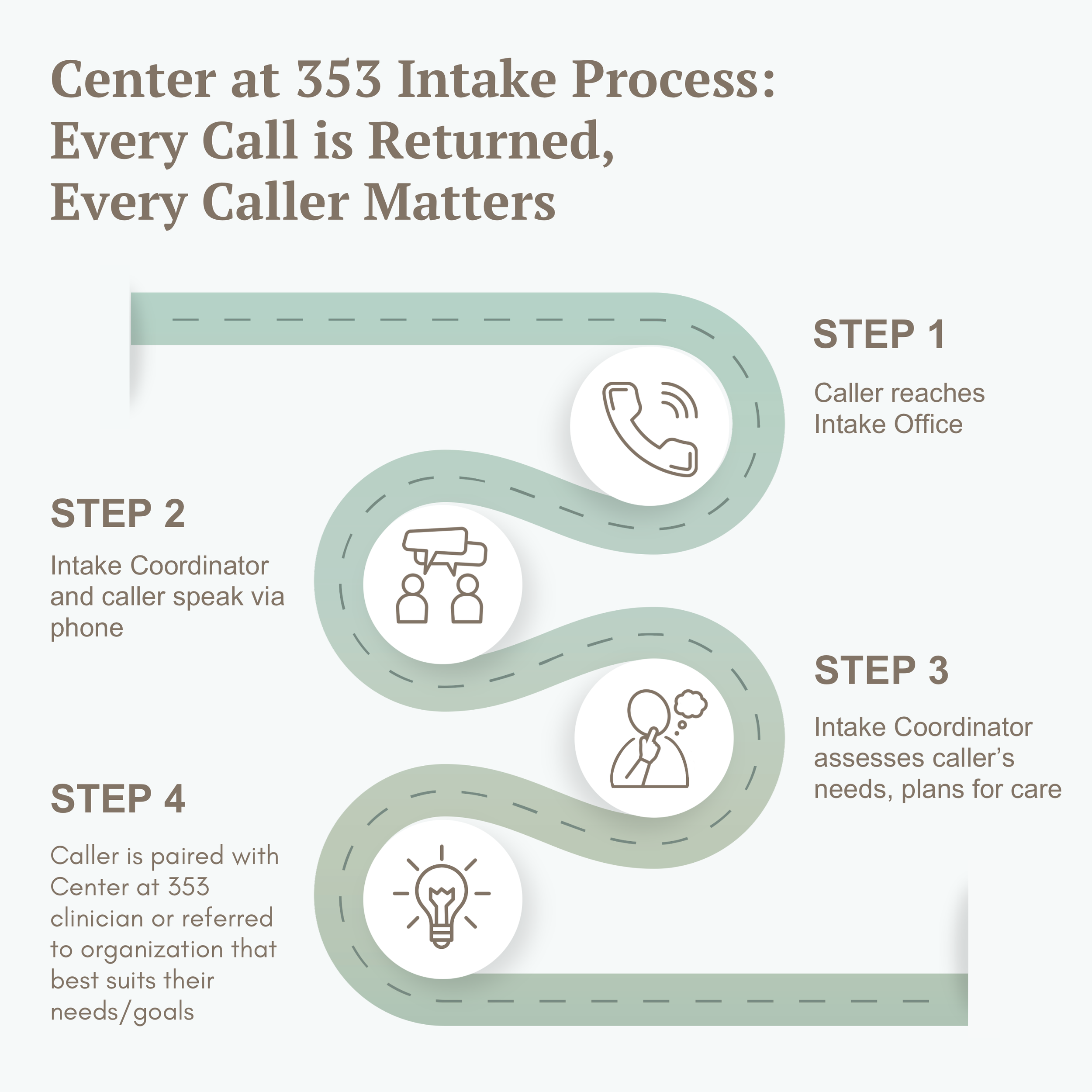 When calling for services, every prospective client is screened by a licensed intake coordinator. Multiple referrals are given when Center at 353 is not an appropriate fit for treatment.